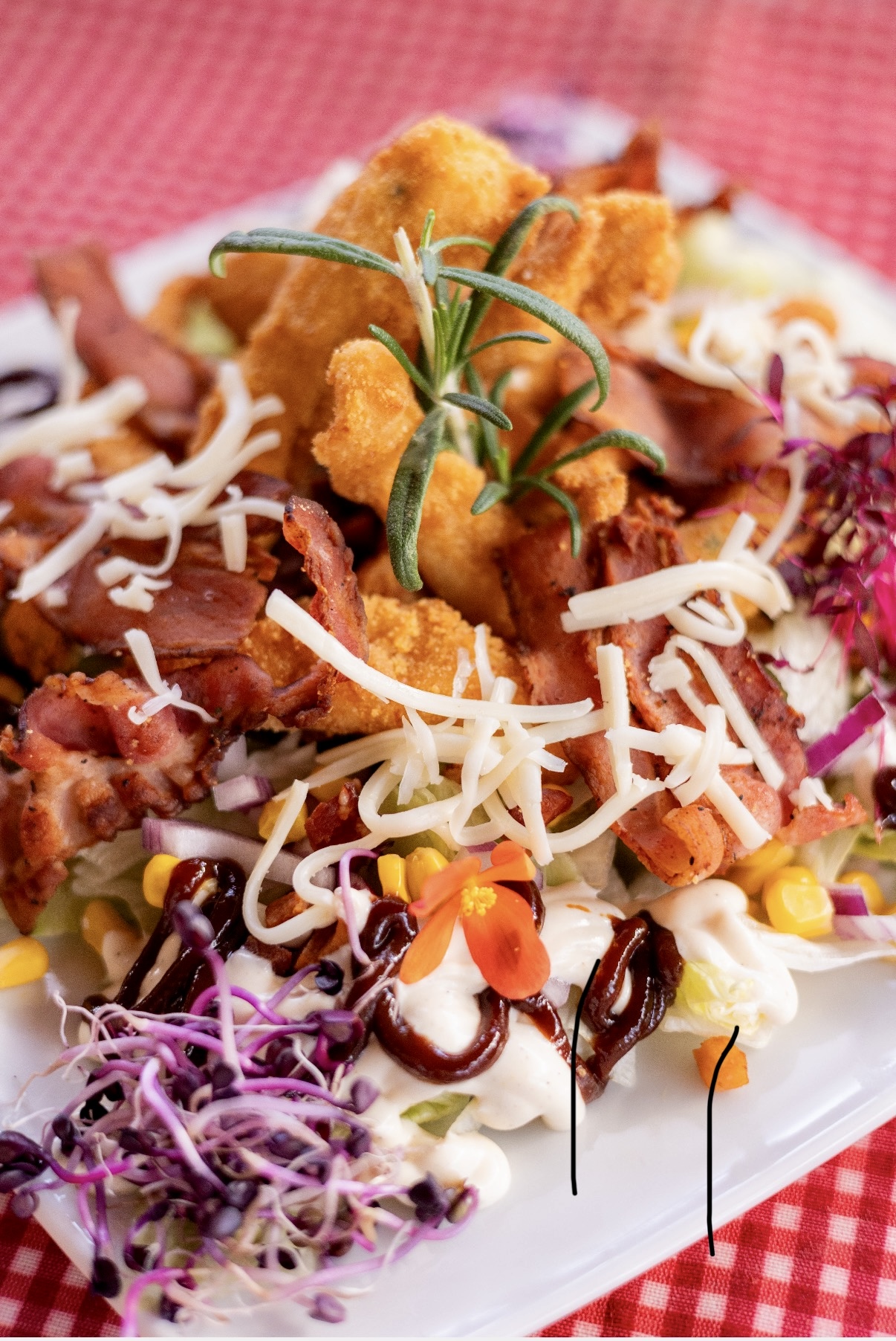 jégsaláta,csemegeuborka,lilahagyma,kukorica,piritott szalonna,rántott cs.mell csíkok,pirított egész bacon,tartár,BBQ,reszelt sajt