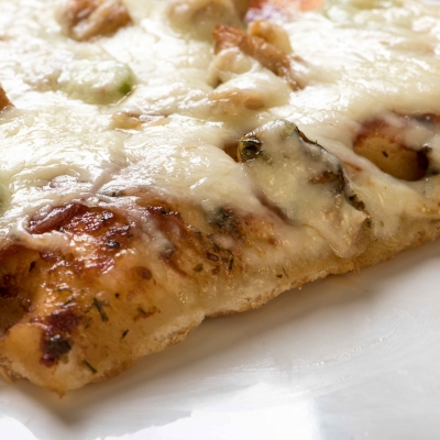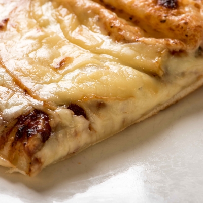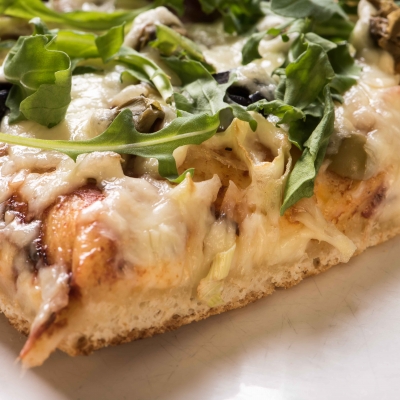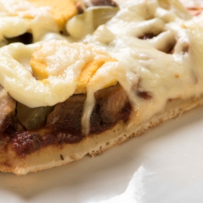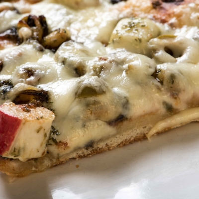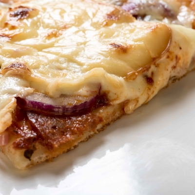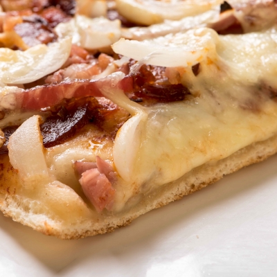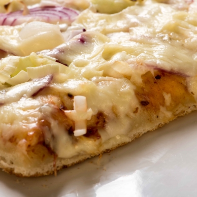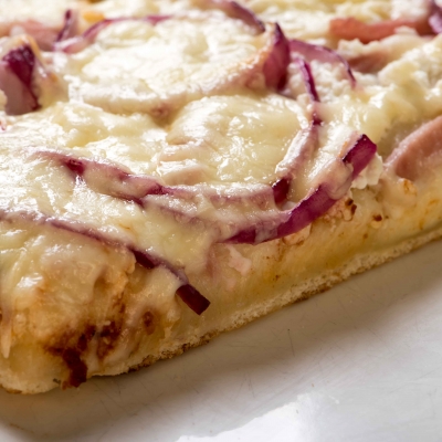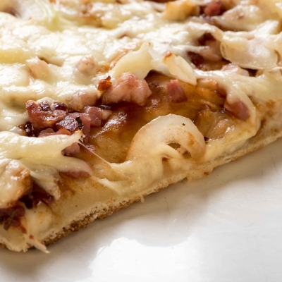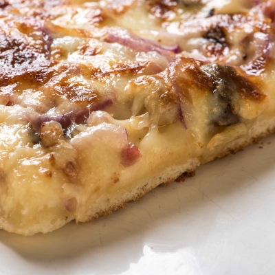 Tejszínes-sajtos alap, lila hagyma, friss gomba,pirított bacon,...